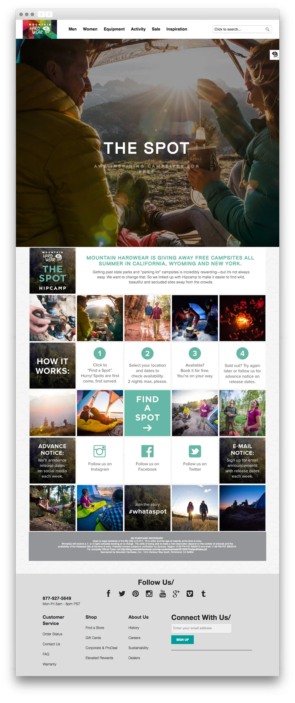 The Spot was a collaborative campaign launched by Mountain Hardwear and Hipcamp.com to build brand awareness while encouraging car-campers to step outside of their comfort zone and experience true wilderness. Our marketing team collaborated with Hipcamp and private landowners to provide remote backcountry sites away from high-season crowds at no cost. Participants were also introduced to the benefits of higher-end outdoor products by way of free equipment rental. I designed and coded landing pages, collaborated with product and marketing teams at Hipcamp on the booking experience, and designed display advertising and social media campaigns to generate interest and participation.