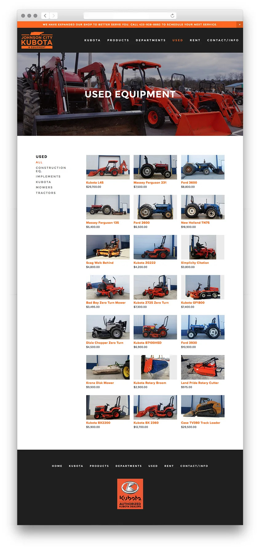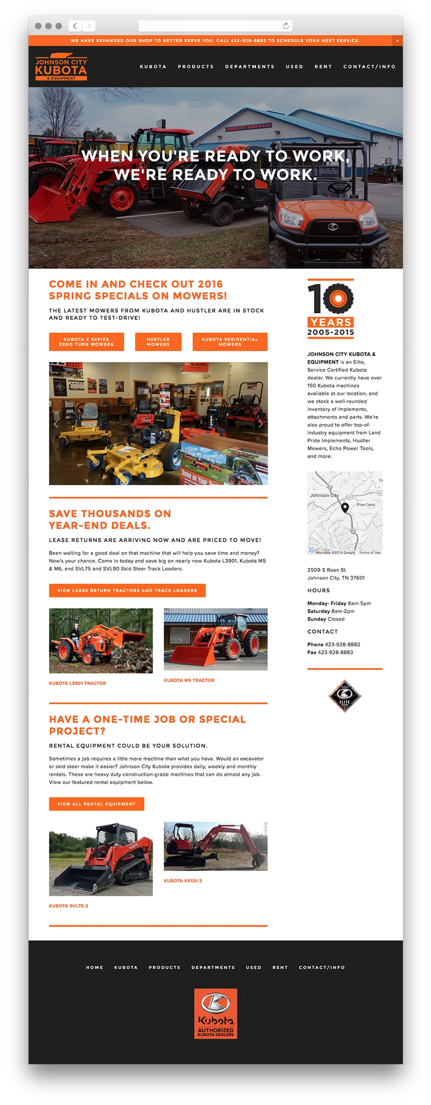 Johnson City Kubota is a small tractor and equipment dealership located in East Tennessee started by farmers for farmers. I worked directly with them on-site to develop an identity and marketing platform including logos, a photography style guide, voice tenets, and an easily managed and updatable Squarespace site.
